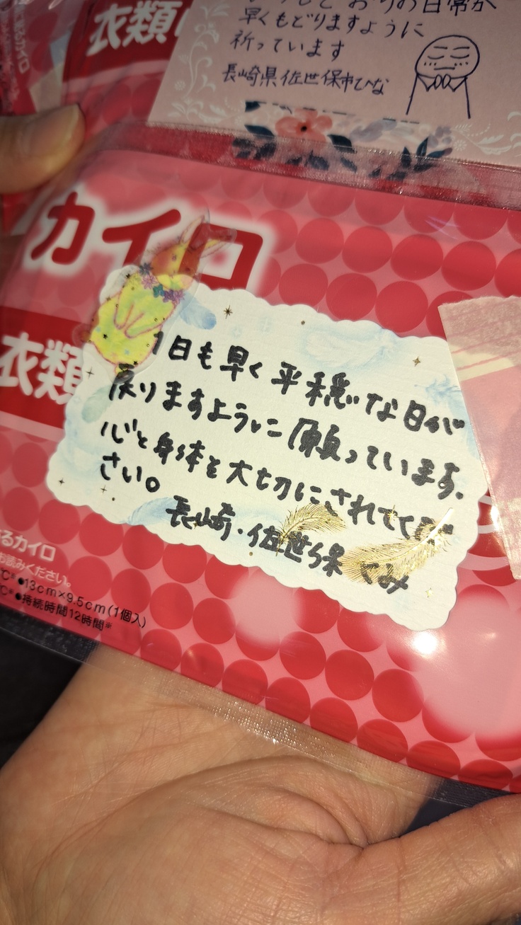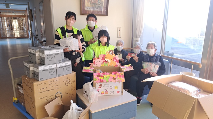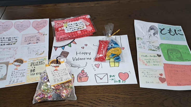 励ましのメッセージカード付きのバレンタインチョコとカイロ、そしてブランド米ひとめぼれのお粥をたくさん持ってきてくださりました