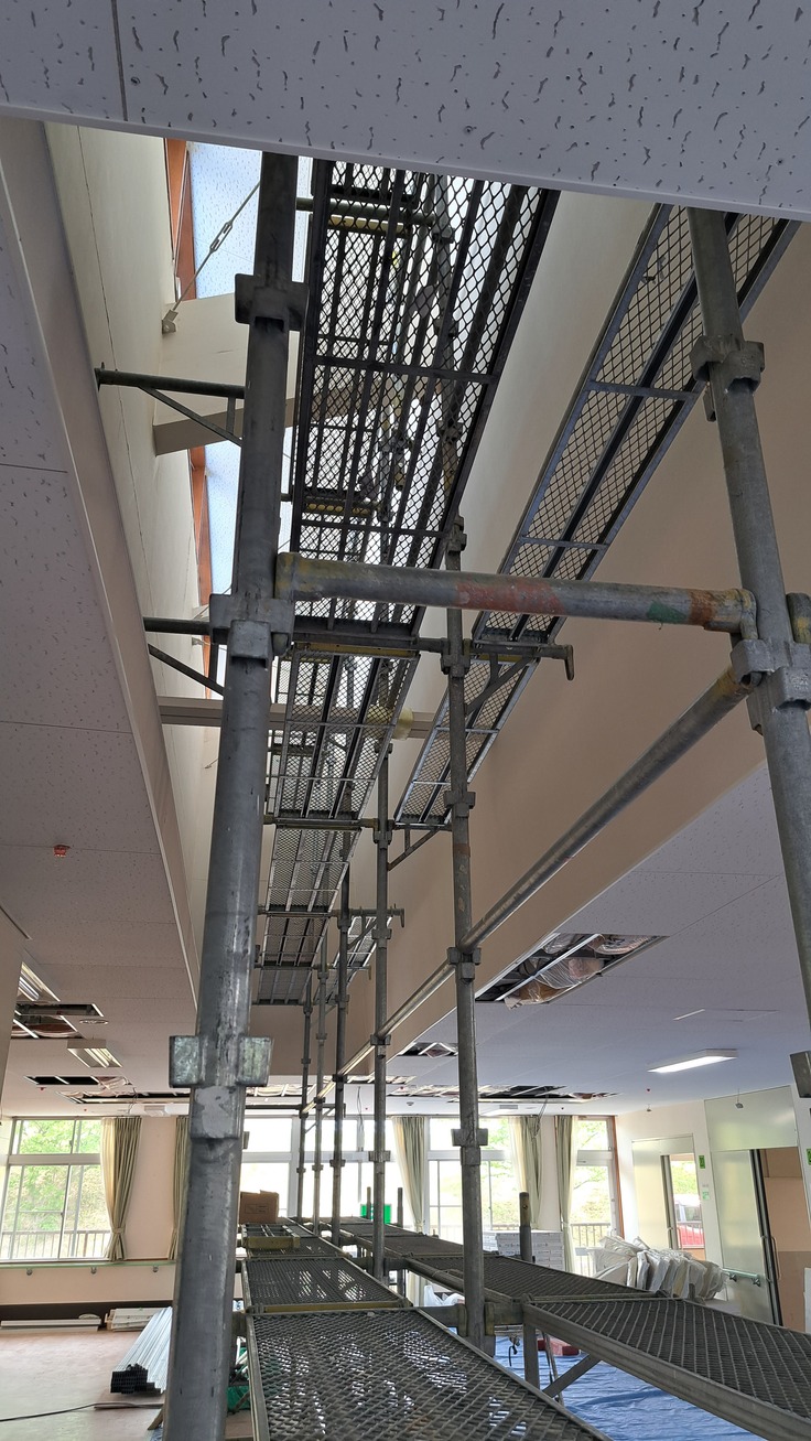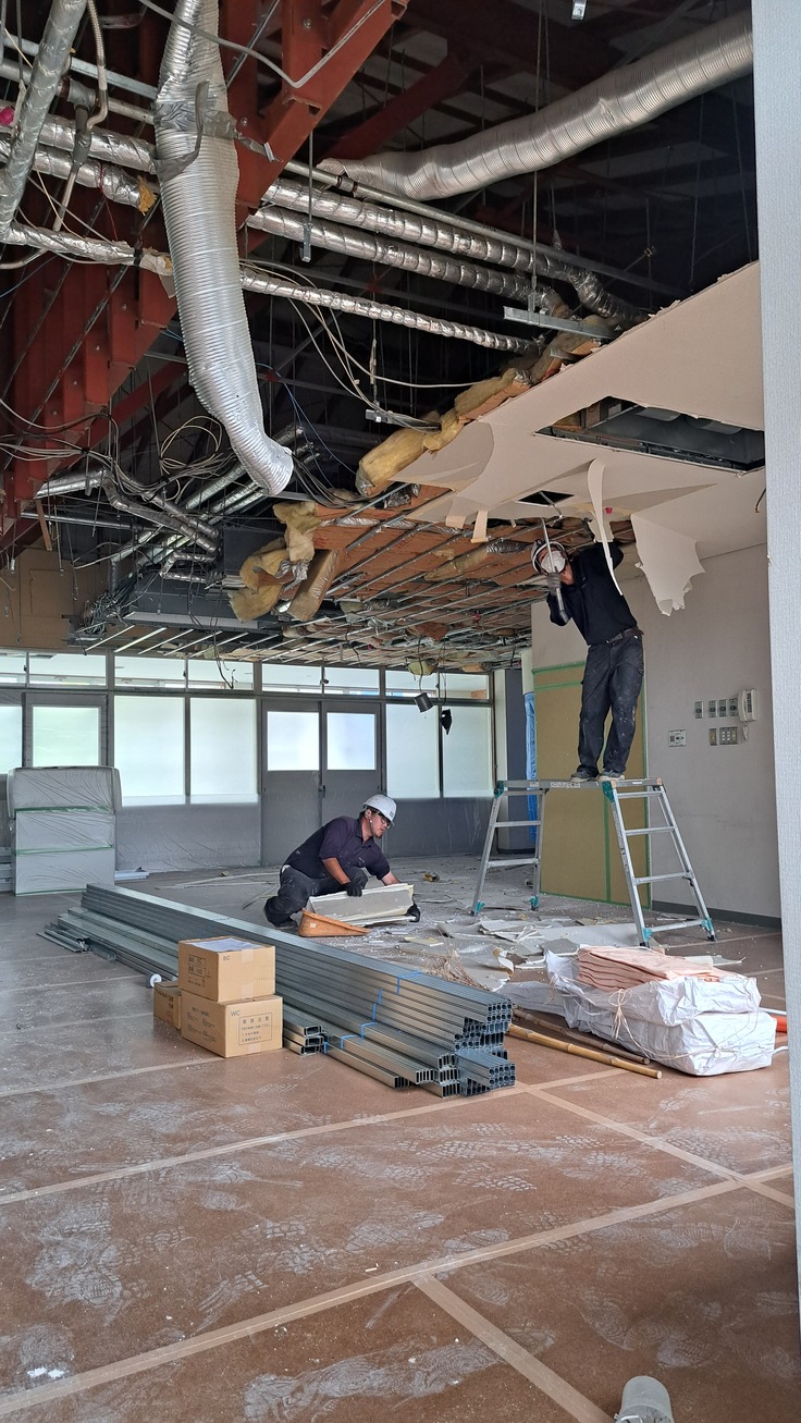 今日からさらに通所利用者様が使うお部屋、デイルームの天井も解体して全部一旦撤去です
