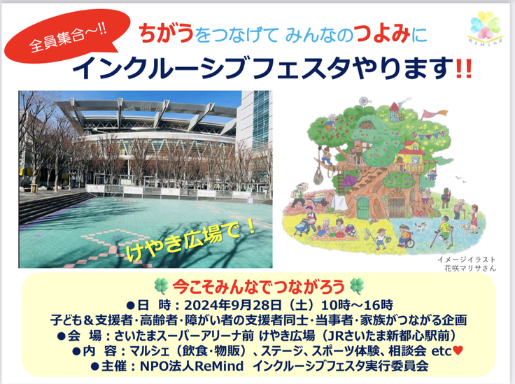 皆様のご支援のお陰で、9月28日(土)当日はさいたま新都心けやき広場にてインクルーシブフェスタを開催することが出来ます!!