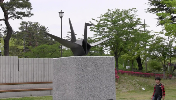 広島で折られた鶴がニューヨークに行って、福島に戻ってきた、ふしぎな鶴なんです。しんじ君は、よくこの公園で親友のたっちゃんとサッカーをしたり、遊んでいます。しんじ君役を演じている幸希君も郡山市出身で、よく開成山公園で遊んでいたそうです。