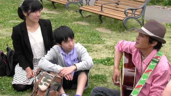 しんじ君のお父さん役で郡山在住のミュージシャン カリキムチさんが歌で息子を贈るシーンを演じてくれました。このとき、お父さんが演奏していた曲は「翼をください」。すべての子どもたちが自由の翼をもてるように・・。そんな願いがこもった曲が、映画では大きな意味を持ってきます。。え、どんな意味・・って。それは明日のお楽しみ〜♪
