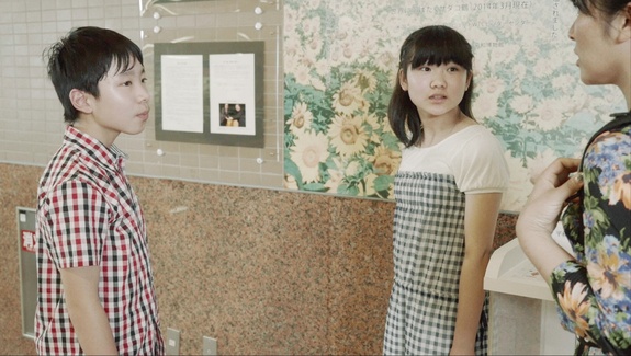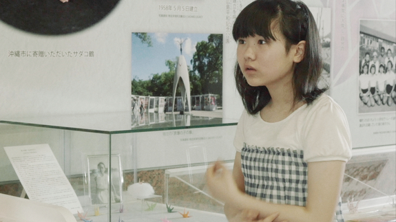 (写真/この映画のもう一人の主人公、福島から沖縄に移住してきた”しんじ”が、サダコの鶴の前で、運命の少女と出会います。クゥ・・よくできた台本!)