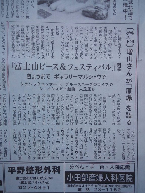 静岡の岳陽新聞 6月28にち版に 「サダ子の鶴」についてをお話しさせていただいた ピースアートフェスティバルの記事が掲載されました(^O^)