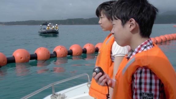 (写真/辺野古の海 オレンジの輪の向こうは米軍基地となる予定の”制限区域”。「制限区域の海は誰のものなんですか?」とサダコが海上保安庁に問いかける)