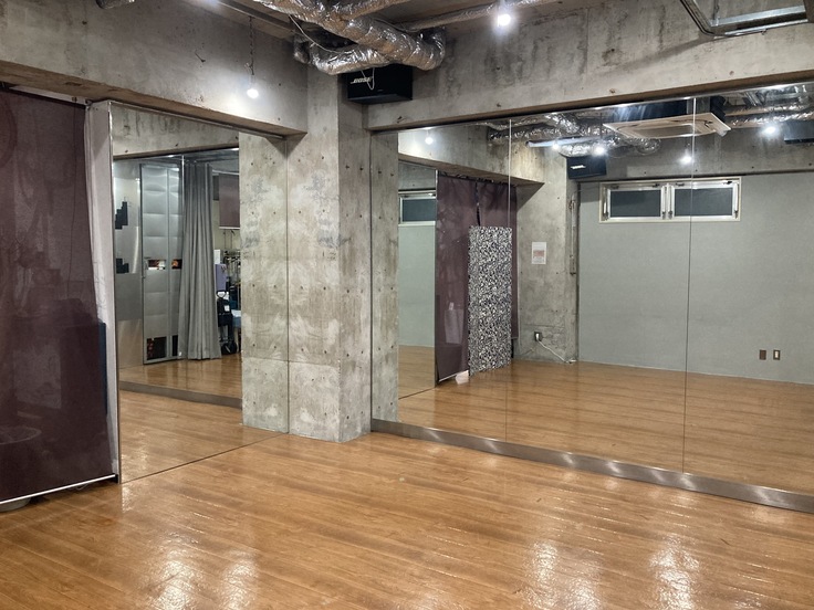 ▼正面だけでなく、横にも直交するワイドサイズのミラー。ダンスや振り付け、ポージングなどで気にかかる、横からの姿も確認できます。天井打ち抜きのため高い位置までミラーがあり、手を上げたりジャンプしてもその姿を逃しません。床面にはクッションフロアを敷いてあるため、膝などをついてもやさしい感触です。