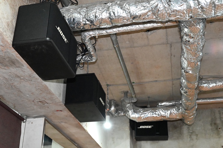 ▼スピーカーは安定のBOSE。高・中・低音がバランスよく聴こえます。天吊りとしたことで、室内に気持ちよく音が響いていきます。