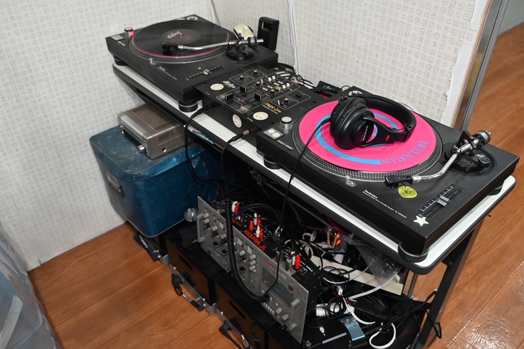 ▼レコード・CD・MD・カセット・スマホ・タブレット音源を流せる音響ブース。6L66真空管アンプは、小音量でも高音質なサウンドを提供します。思いきり音量が出せる立地条件ではないので、音のクオリティを高めることを重視しました。