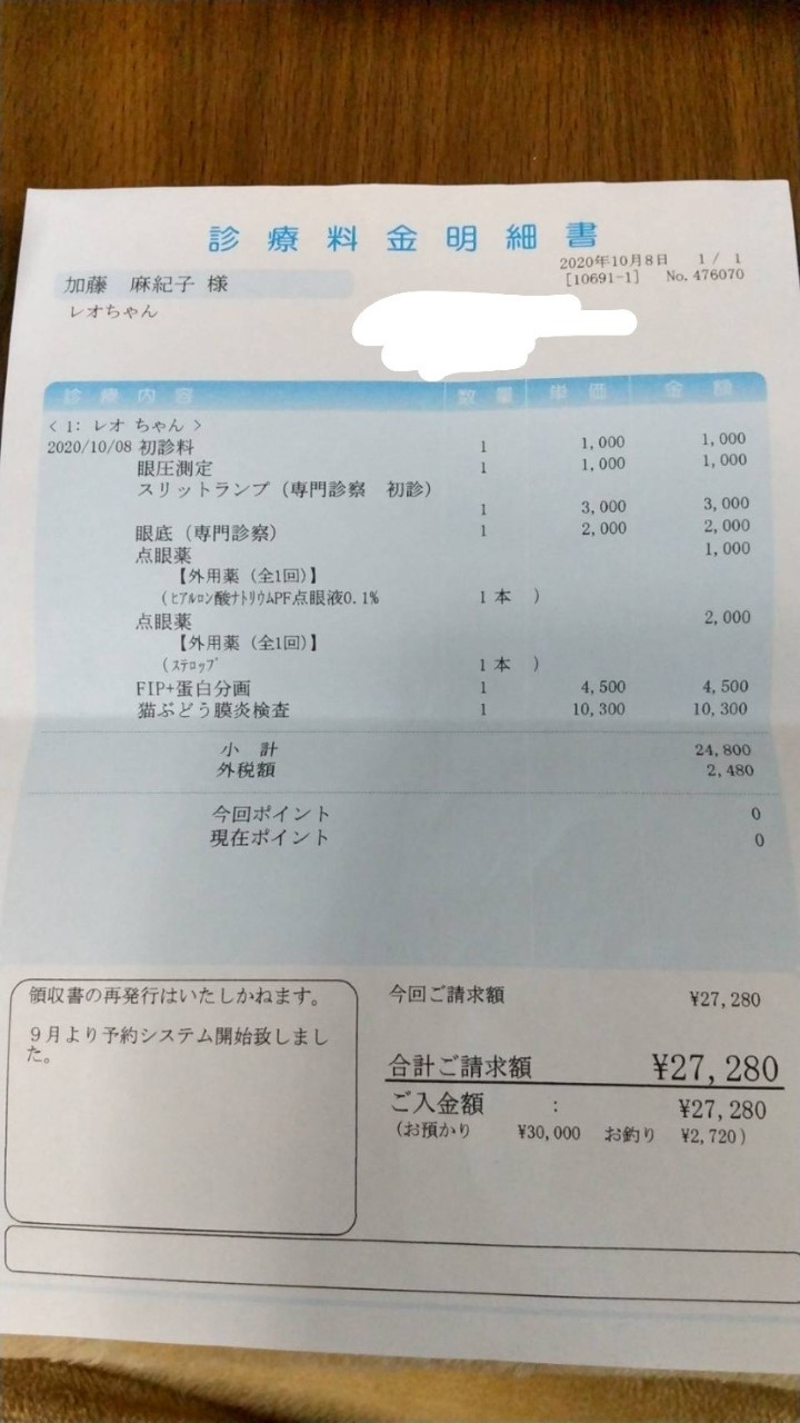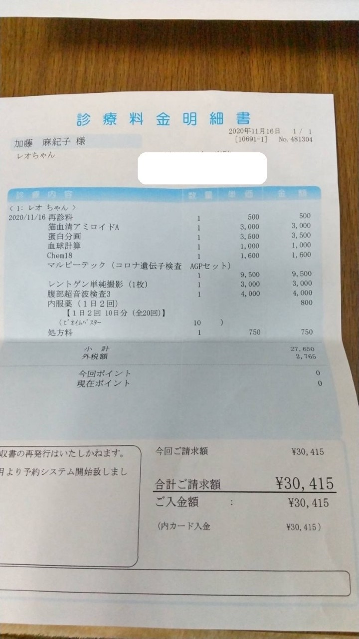 当初より体重が増えた為FIPの薬代と検査費用で170万かかりそうです。
