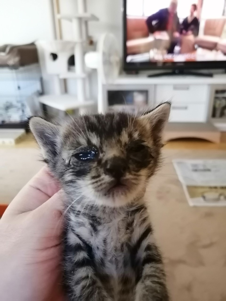 3か月の子猫にステロイドは使えず、抗炎症薬点眼液をもらい帰りました。