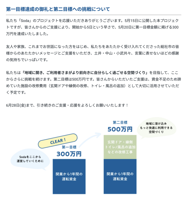 皆様の温かいご支援が、「soda」の更なる発展と利用者の笑顔に繋がります。少しのご支援でも、未来を明るくする大きな一歩となります。ぜひ、この素晴らしいプロジェクトにご支援をお願いいたします。