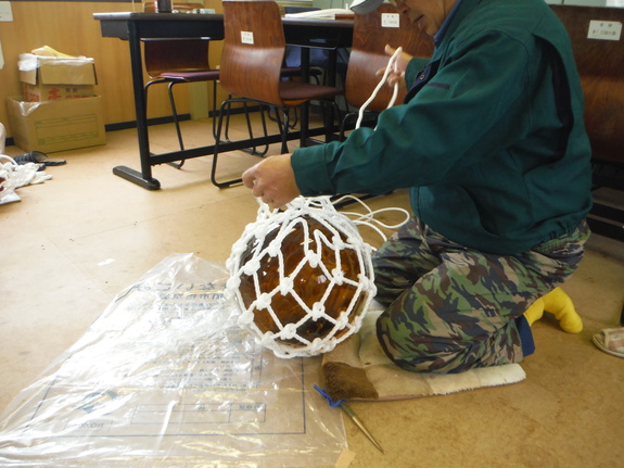 このビン玉作りも本来であれば、気仙沼ライフセービングクラブで行えれば良いのですが、丸いガラス玉の周りを網の目の様に編み込むという特殊な結び方は慣れていない人間にとっては、予想以上に大変な作業です。
