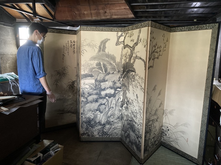 (掃除中のヒトコマ。2階の物置には大きな屏風がありました。)