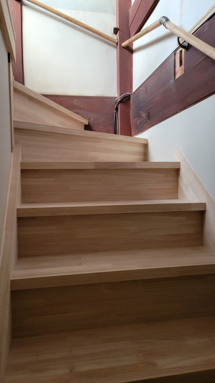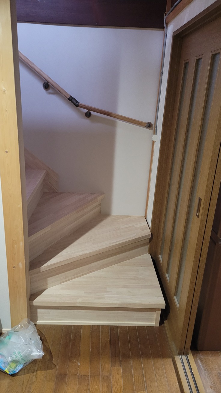 階段が狭くて急だったので、広く上りやすい階段にしました。設置する方向なども変わっています。
