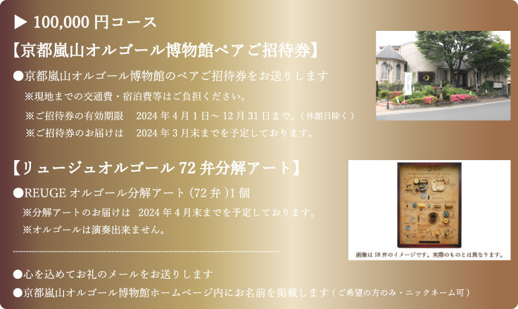 京都嵐山オルゴール博物館が所有している「ギド・リュージュコレクション」の一部を修復し、博物館にて保管、展示します。ご支援いただいた費用は全て、コレクションの修復費用に充当します。