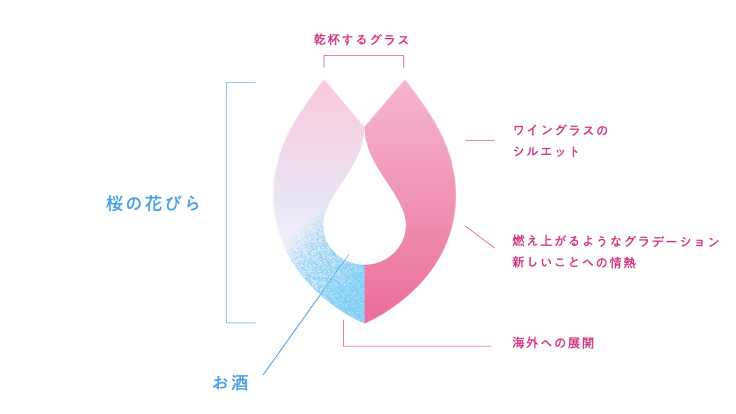 また、日本酒の雫、それを包み込むグラス、そして海を越えて世界に飛び立とうとする想いを込めたカンパニーロゴです。