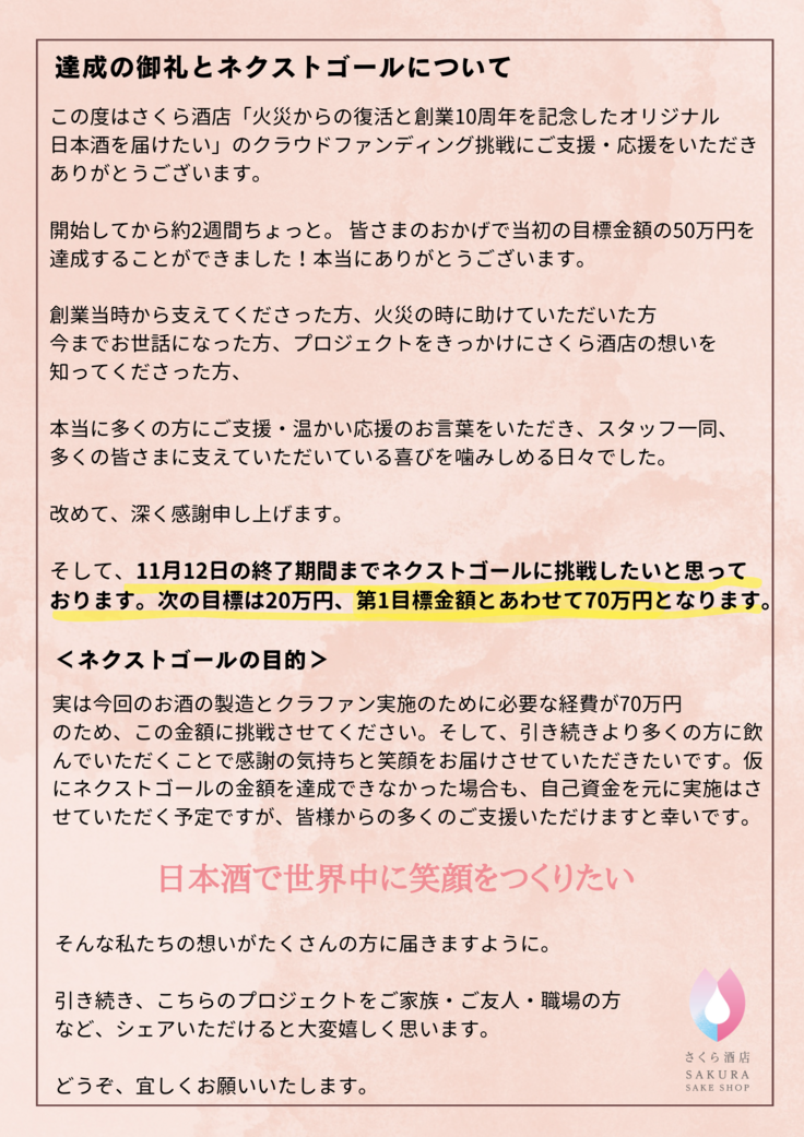 創業当時から支えてくださった方、火災の時に助けていただいた方、今までお世話になった方、今さくら酒店の想いを知ってくださった方、すべての方々に届けたい日本酒です。