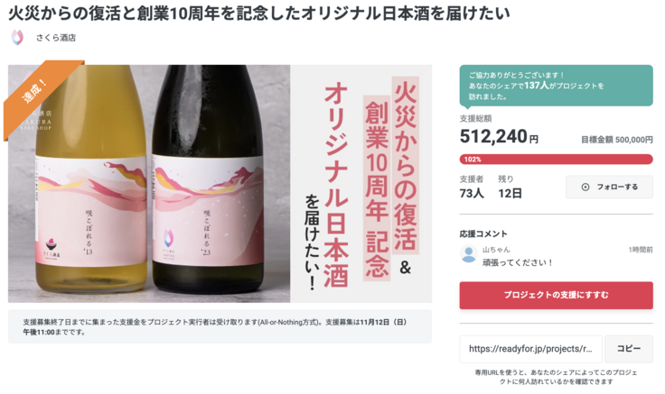 この度はさくら酒店「火災からの復活と創業10周年を記念したオリジナル日本酒を届けたい」のクラウドファンディング挑戦にご支援・応援をいただきありがとうございます。
