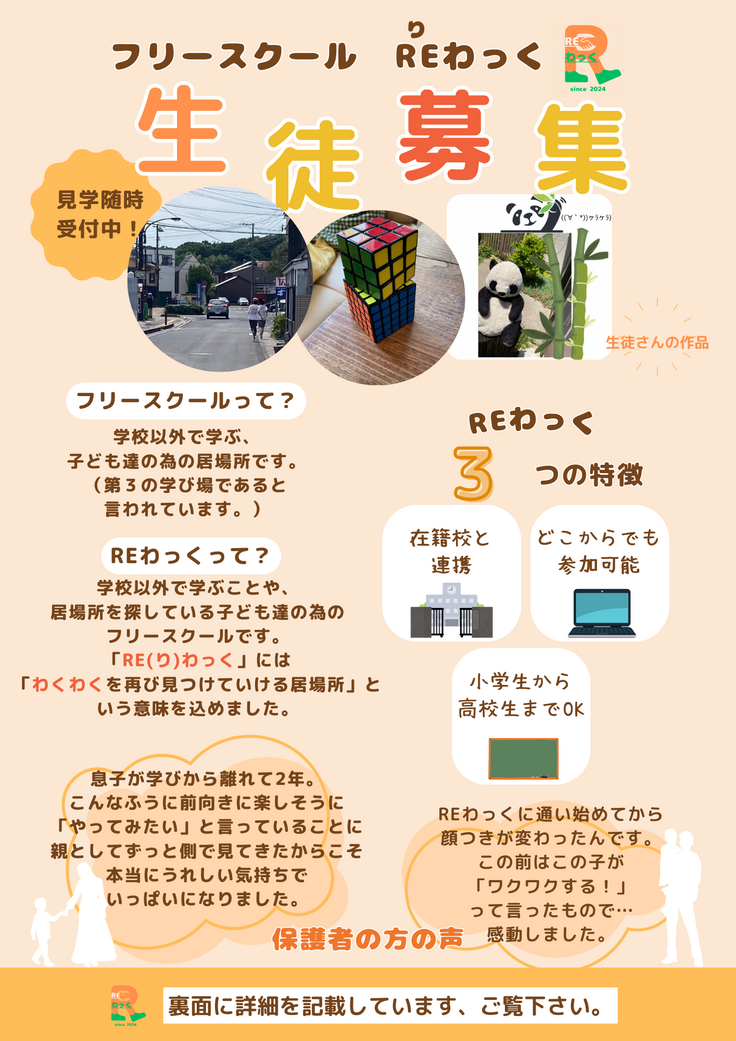フリースクールREわっくの見学ができます。子どもたちと話すこともできますし、オンラインですることも可能です。オンラインでゲームすることも好きな子たちですので相手してもらえたら喜びます。