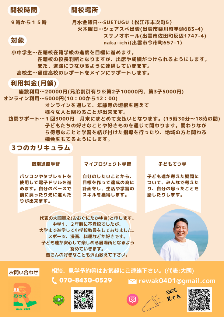 合同会社Relife代表の大國貴之(おおぐにたかゆき)と申します。です。島根県出雲市松江市でフリースクールREわっくを開校しています。