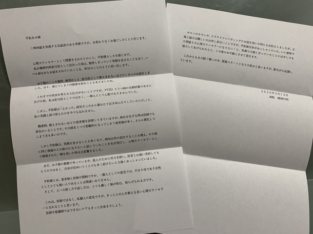 これまでの状況を考えたら仕方がないことですが、PTSDとうつ病の末期状態であると告げた時、私は担当医としてではなく、一個人として心配でなりませんでした。