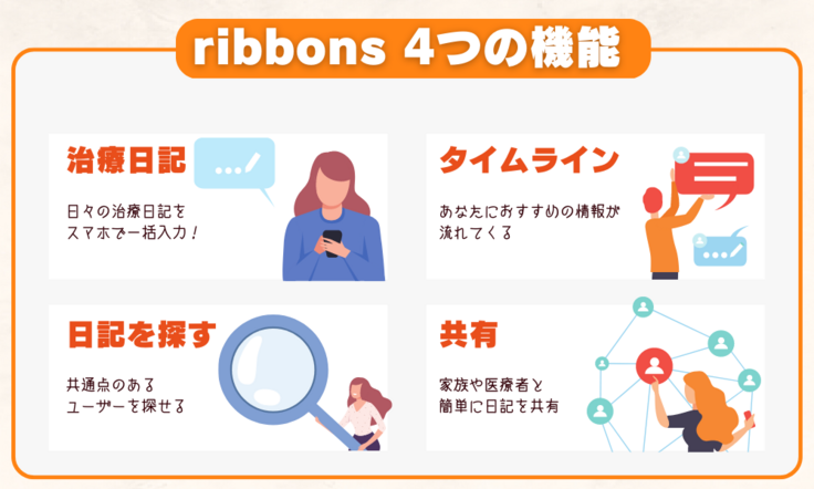 ribbonsには「治療日記」「タイムライン」「日記を探す」「共有」の4つの機能があります。