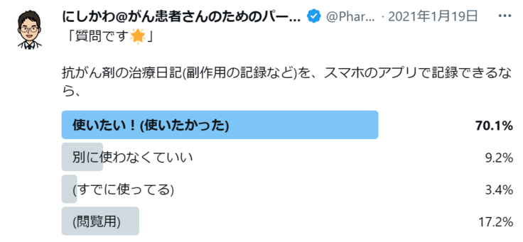 一人ひとりの記録が他の患者さんにとって貴重な情報になり、漠然とした不安感を解消することができます。