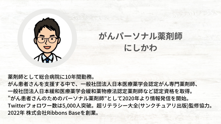 「がんパーソナル薬剤師にしかわ」こと、株式会社Ribbons Baseの西川隆一です。