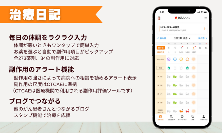 ribbonsの特徴は、記録した治療日記を共有できること。