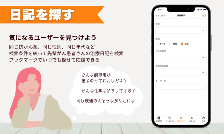 例えばこれから始める抗がん薬についての情報が欲しい時、薬の名前を入れて検索することで、同じ薬を使っている方の治療日記を見られます。