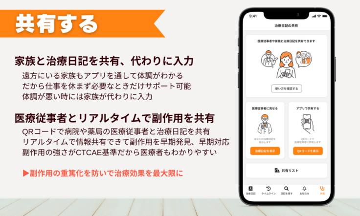 家族や医療従事者とリアルタイムで治療日記を共有することができます。