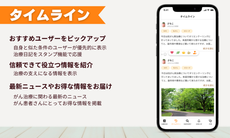 SNSのように他のがん患者さんのブログをタイムラインで表示。