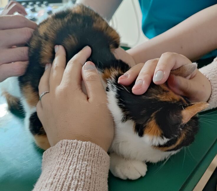 エコー検査中 おとなしいので検査はしやすそうです。でも凄く緊張しているので、撫でて癒しながらの検査です