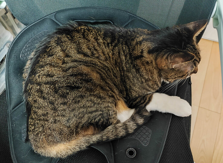 隙があればテレワーク用の椅子を乗っ取るので… 昔の椅子を復活させて猫が好きな丸いものを置いて、そっちをルナ用にしています。椅子に付く毛の量がすごい…