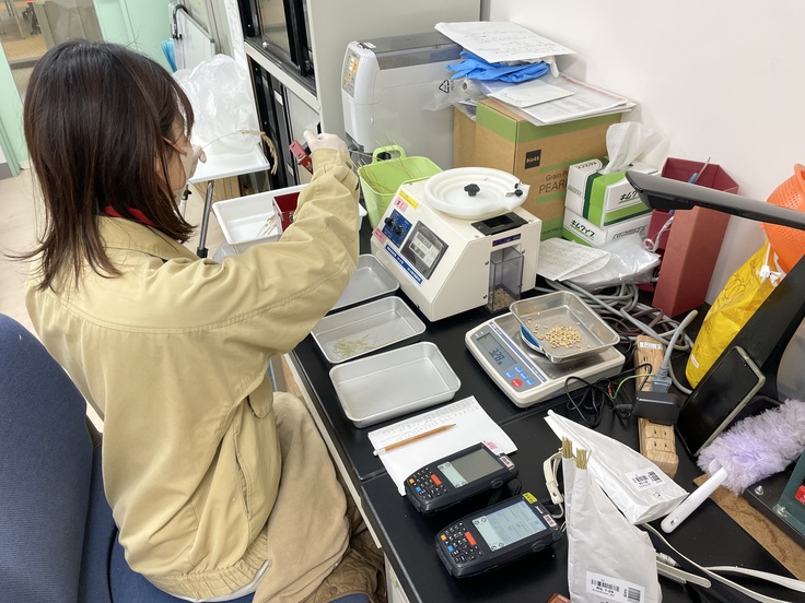 4月から栽培をはじめて11月に収穫は完了します。約4000品種・系統が対象になります。その後部屋に持ち帰って、重量測定や数えたりなど計測してデータに基づいて候補となる新品種を決めていきます。