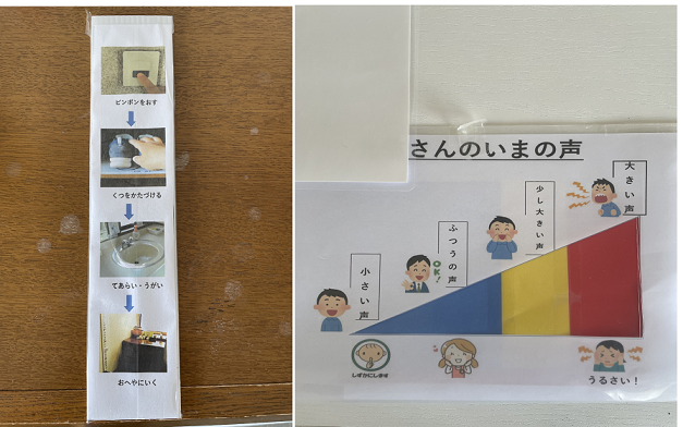 来年入所予定の人が体験実習に来られた際、なかなかお部屋に行くことができない時に使いました。ひとつひとつの行動を言葉ではなく視覚的に示すことで、納得して行動できることがあります。