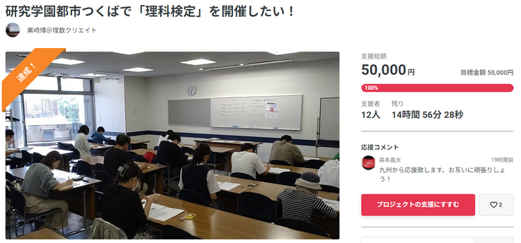 【研究学園都市つくばで「理科検定」を開催したい!】が達成しました!
