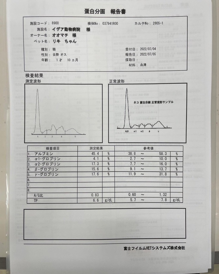 先日の血液検査の結果がでました😊 経過は順調です💕 蛋白分画も正常な波形に戻ってきました✌️ いつも応援して頂いている皆様からの 温かい思いがこの結果に繋がっております🙇💕 本当に感謝致します🙏 5ヶ月後の『寛解』目指して、 これからもりきと一緒に頑張っていきます💪