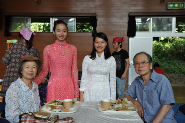 みなさん、こんにちは。 きょうはベトナムチームの仲間とメニューの紹介です。 トレードマークは、なんといっても美しい民族衣装アオザイです。 ジーンズ姿でばりばりお料理していたかと思ったら、お客さまがみえるころに は、あでやかに変身! 写真は2015年のベトナムチームです(アオザイはリンさんとファムさん)。