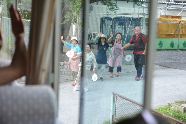 炊き出しが終わってバスで帰るとき、仮設住宅のみなさんが見送りをしてくだ