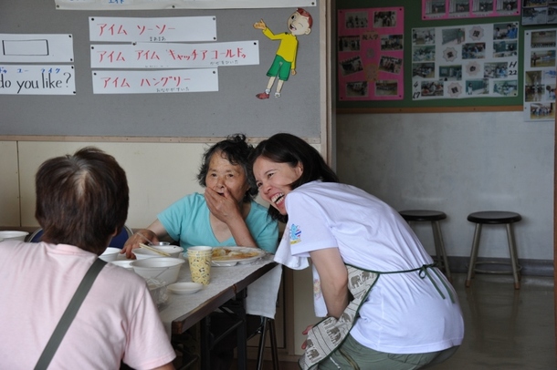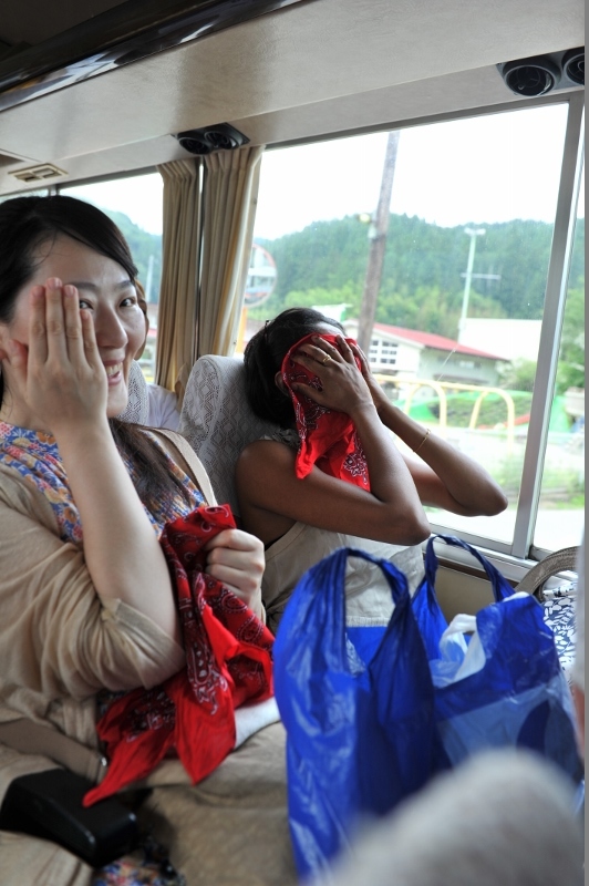 炊き出しが終わってバスで帰るとき、仮設住宅のみなさんが見送りをしてくだ さいました。 それを見て、わたしたちは泣いちゃいました… ディラーニさんはとっても 泣き虫。
