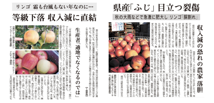 (右)さらに昨年は、日焼けで傷んだ実が一気に雨を吸うことで実が割れるとみられる「胴割れ」という現象も発生した。(2024年12月10日付信濃毎日新聞朝刊)