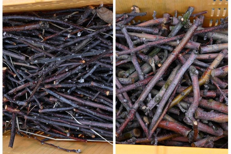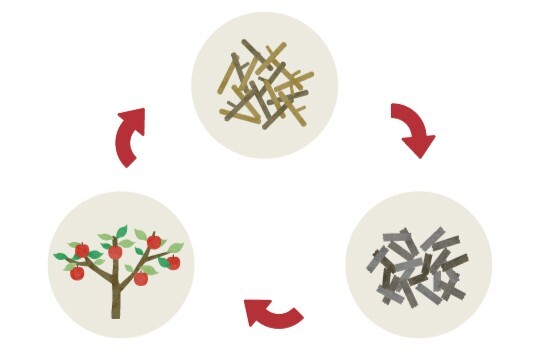りんご農家さんたちは冬の間、次のシーズンの栽培を見据えて木の形を整える「剪定」をするので、毎年たくさんの切った枝(剪定枝)が発生します。ただ、多くの農家ではそれを燃やして灰にすることが一般的といいます。