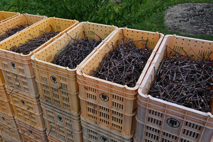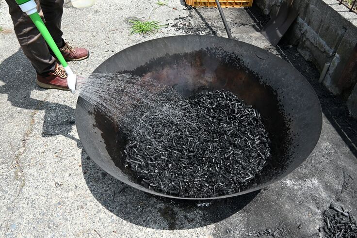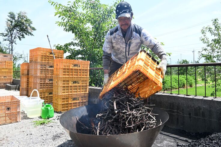 そうした枝の仕分けの手間に加え、切ったばかりの枝は水分を多く含んでいるため、二村さんは切りそろえた枝を農園の一角でコンテナに入れて半年ほど保管し、枝が乾燥した夏頃に炭にしています。