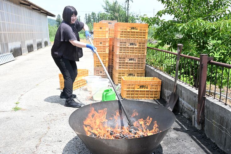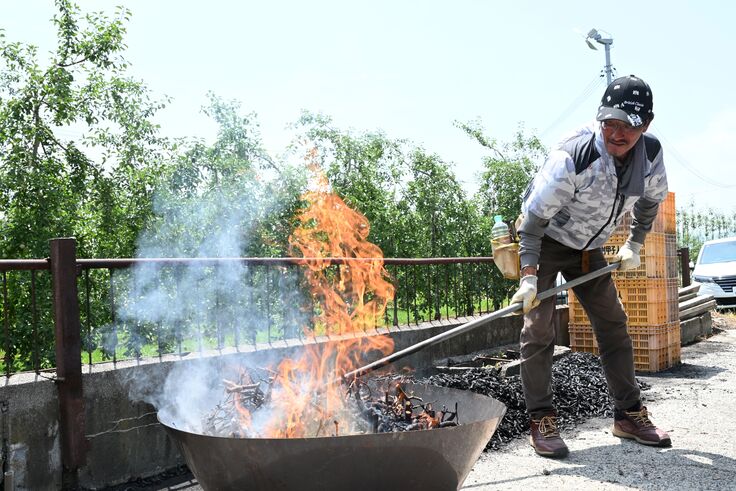 ただ、一度に炭にできる量は限られ、真夏に350度以上の高温にしてコツコツと炭を作る作業は暑さとの闘いです。広大なりんご畑では、切った枝を拾い集める作業も多くの農家さんにとって労力が必要な作業です。