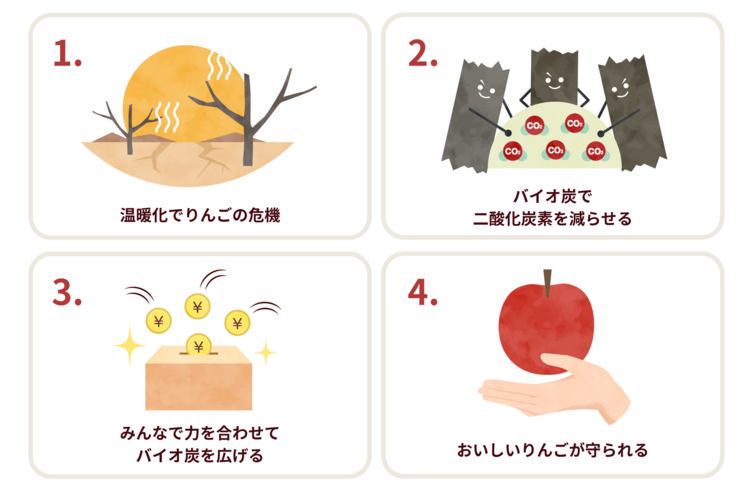 りんご園で生じた枝を灰にせず、バイオ炭にアップサイクルすることで二酸化炭素の排出量を減らし、100年以上先まで閉じ込めておけるこの取り組みを、りんごの栽培環境をはじめとした地球環境を守るために広めていきたいと私たちは考えました。