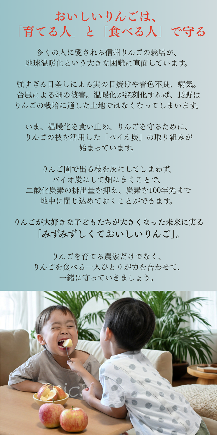 そんな信州りんごの栽培環境を守るためにも、二酸化炭素の排出を減らし、地球温暖化に少しでも歯止めをかけたい――。