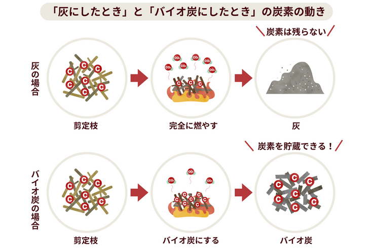 りんごの枝を炭にすると炭素の塊となり、土に埋めても分解されにくくなるため、100年以上も炭素を地中に閉じ込めることができるとされています。また、炭には土壌改良効果もあることが分かっています。