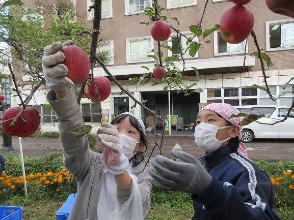 【春のりんご並木】 【秋には来年入学してくる6年生とりんごの収穫】
