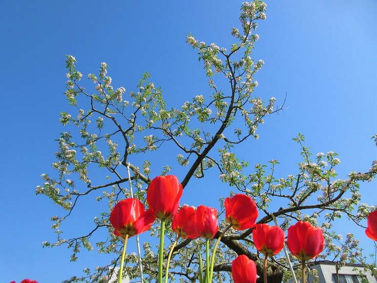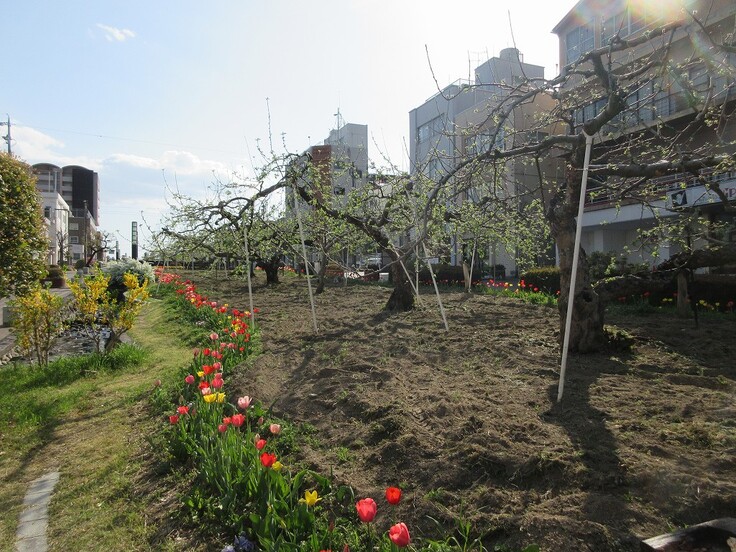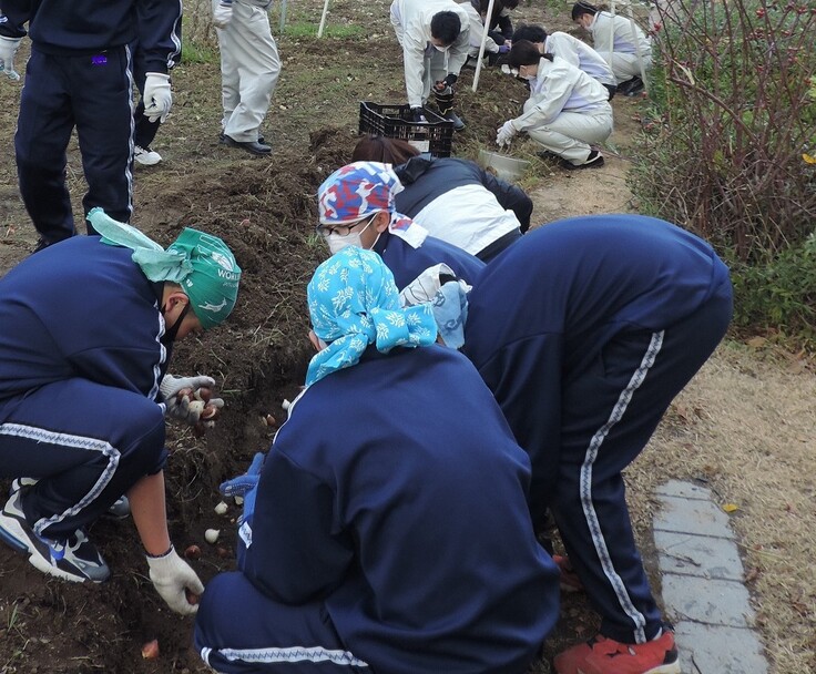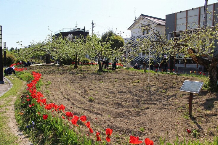 〇12月になるとりんご並木に花を植える会の皆さんと一緒にチューリップの球根を並木の花壇に植えます。春にはチューリップとりんごの白い花が、りんご並木を訪れた方々の目を楽しませてくれます。