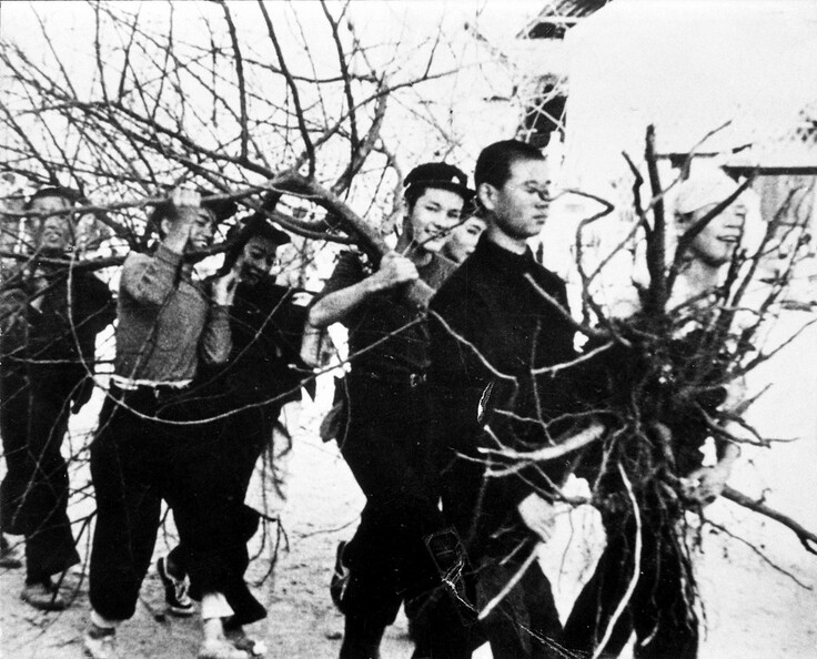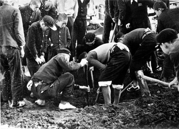 昭和28年11月、飯田大火の教訓を生かすべくつくられた広い防火帯としての道路の中央に、りんごの木を植える生徒たちの姿がありました。農家からいただいたりんごの木を運ぶ生徒。木を植えるための穴を掘る生徒。掘った穴から出てきたがれきを片づける生徒。大変な作業でしたが、その表情は希望に満ちていました。